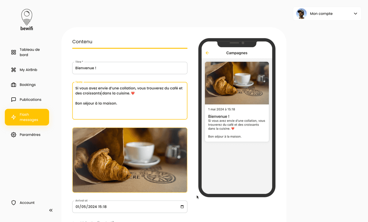 Grâce aux notifications bewifi, programmez des messages de bienvenue, des instructions de départ ou autre communication de votre choix en quelques clics.
